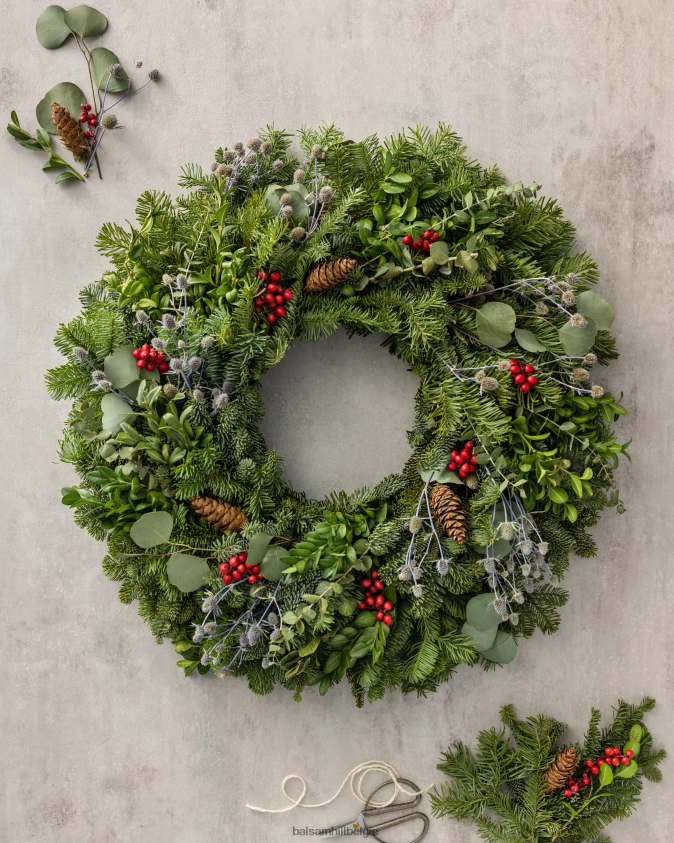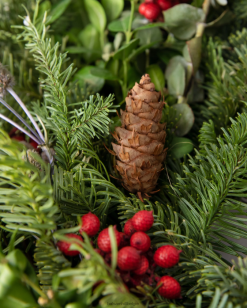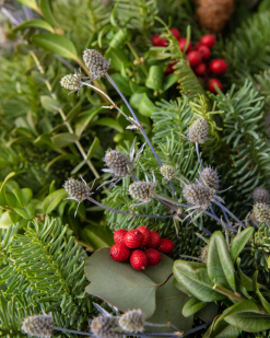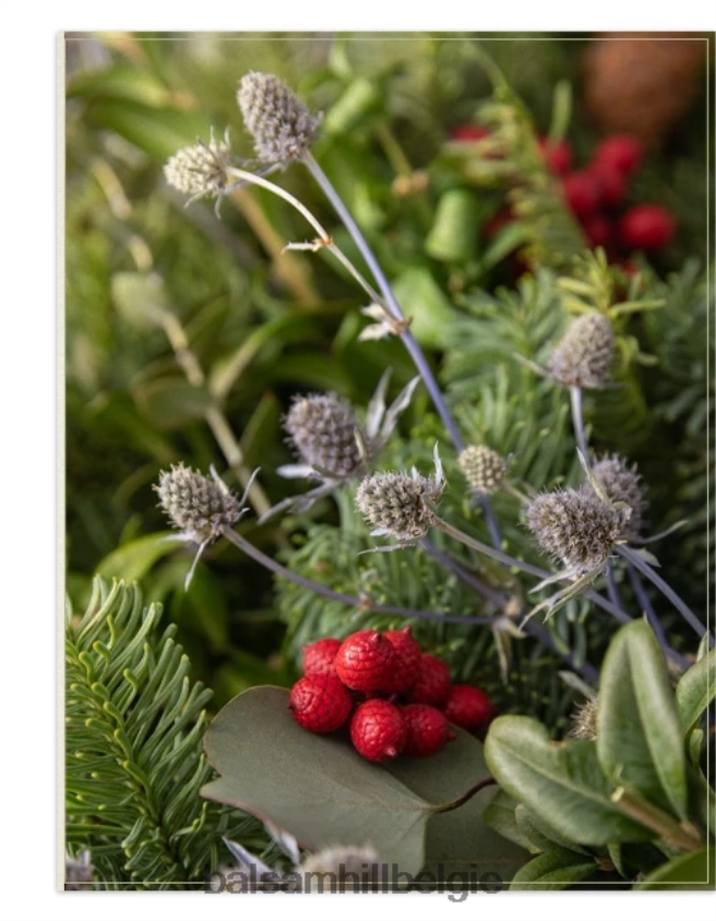 - alle producten in deze collectie zijn voorzien verse edele spar, gezaaide eucalyptus en buxus met natuurlijk gedroogde accenten, waaronder canellabessen, eryngium zeehulst en douglas dennenappels.
