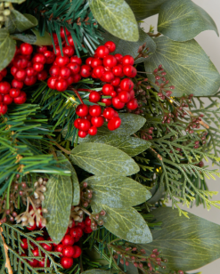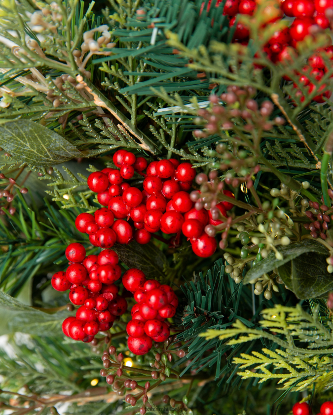 - alle producten in deze collectie zijn voorzien van eucalyptus- en cederbladeren geaccentueerd met twijgen en rode bessentrossen