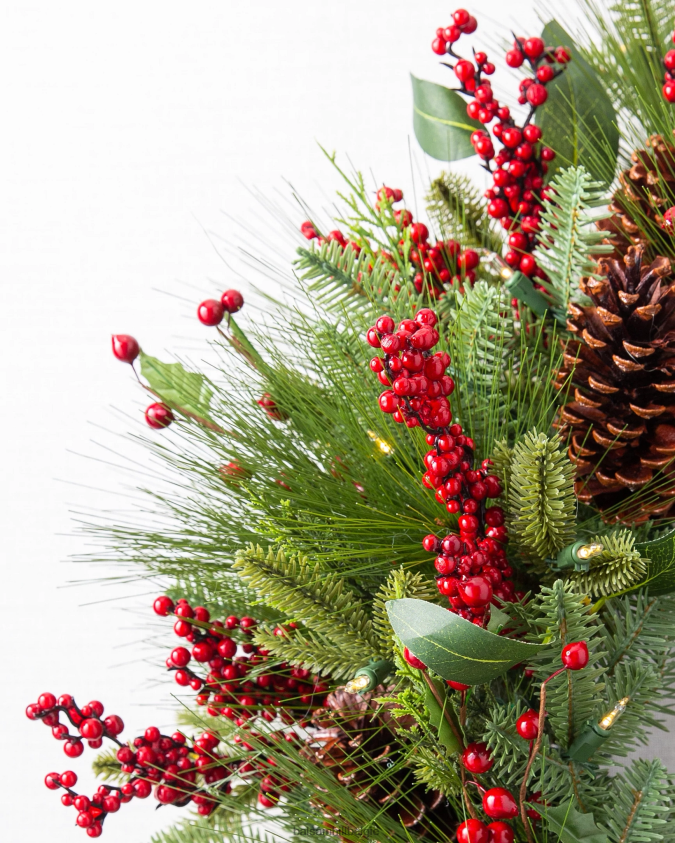 - alle producten in deze collectie zijn voorzien van echt naald blad geaccentueerd met lange naalddennen sprays, dennenappels en neprode bessen