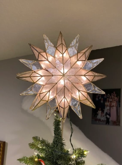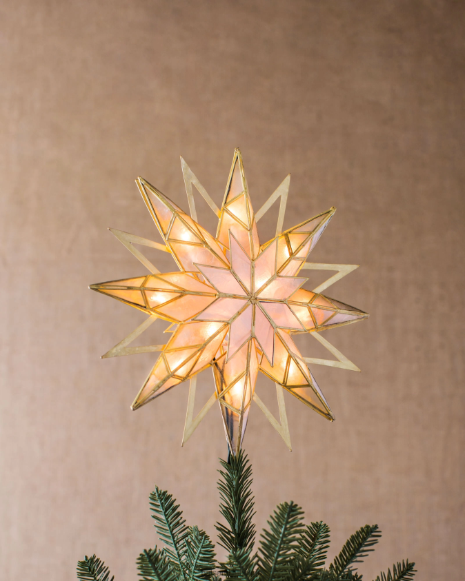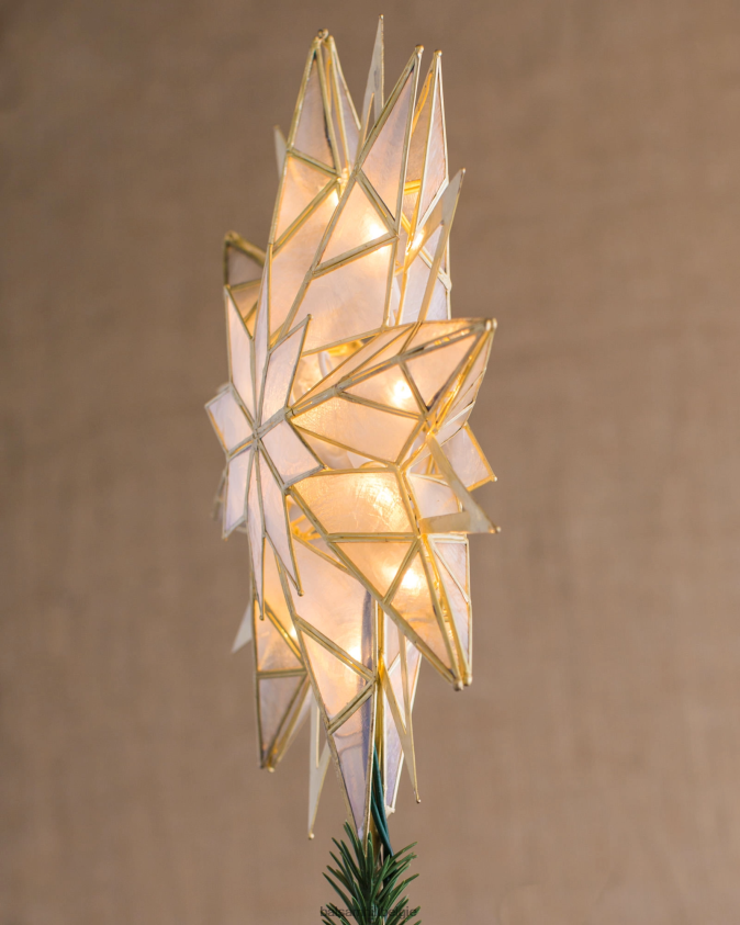 Maak het uiterlijk van je kerstboom compleet met natuurlijke capiz-schelpen. Deze 16-puntige stertopper wordt aangeboden in verschillende maten en kleuren en is overdag prachtig en ‘s nachts zelfs nog betoverender.