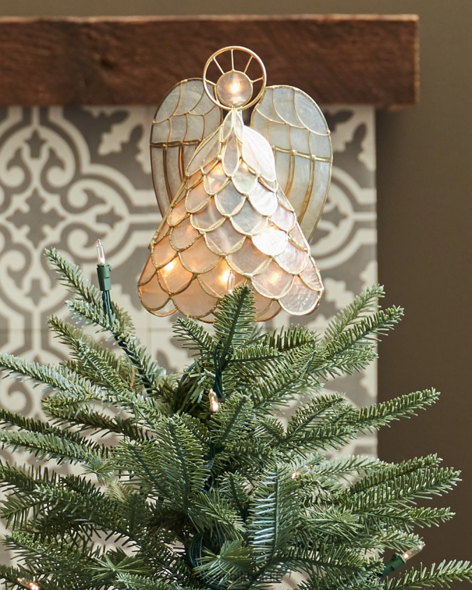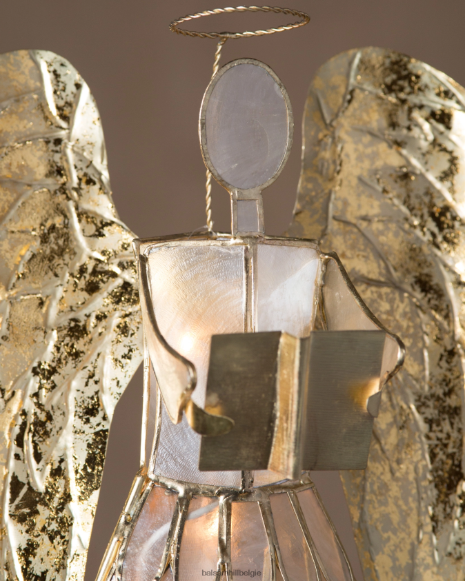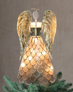 Deze engelenboomtopper is prachtig met de hand gemaakt en is een stralende herinnering aan de vreugde en het wonder van Kerstmis. Gloeilampen werpen een zachte, gouden gloed door iriserende capiz-schelpen, waardoor een gastvrije sfeer ontstaat voor uw vakantievieringen. Dankzij de verwijderbare vleugels zijn deze boomtoppers gemakkelijk op te bergen, terwijl een afneembare paalstandaard ervoor zorgt dat onze kleinere engel kan worden omgebouwd tot een prachtige lamp of nachtlampje.