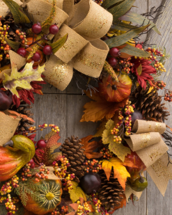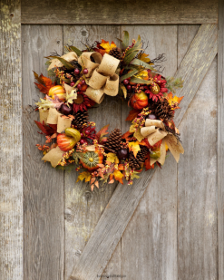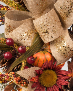 - Alle producten in deze collectie zijn voorzien van esdoornbladeren, kalebassen, zonnebloemen, bessen, dennenappels en jutelint versierd met gouden en bronzen glitters.