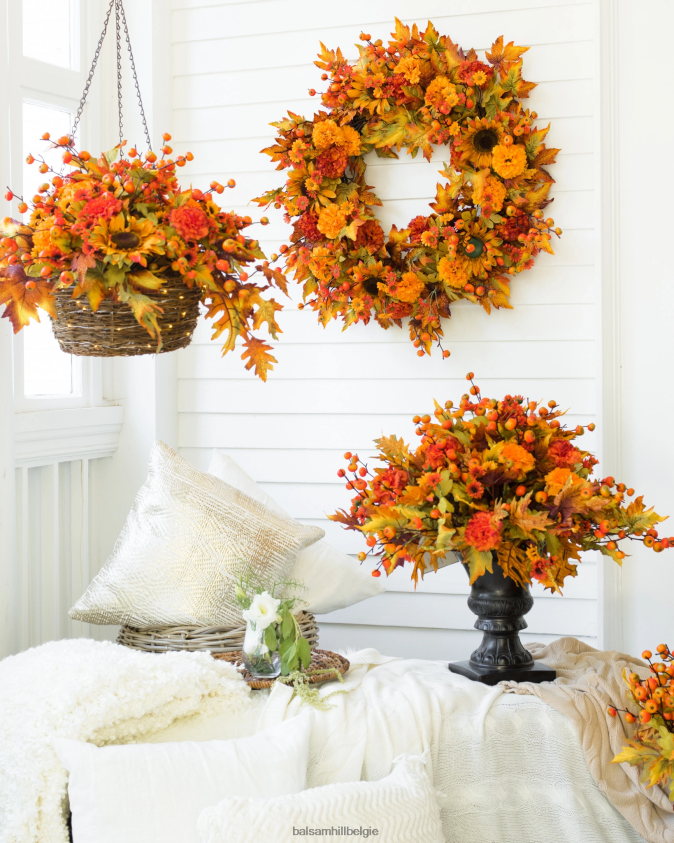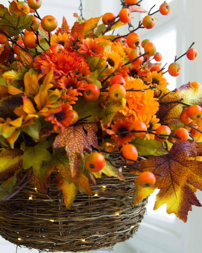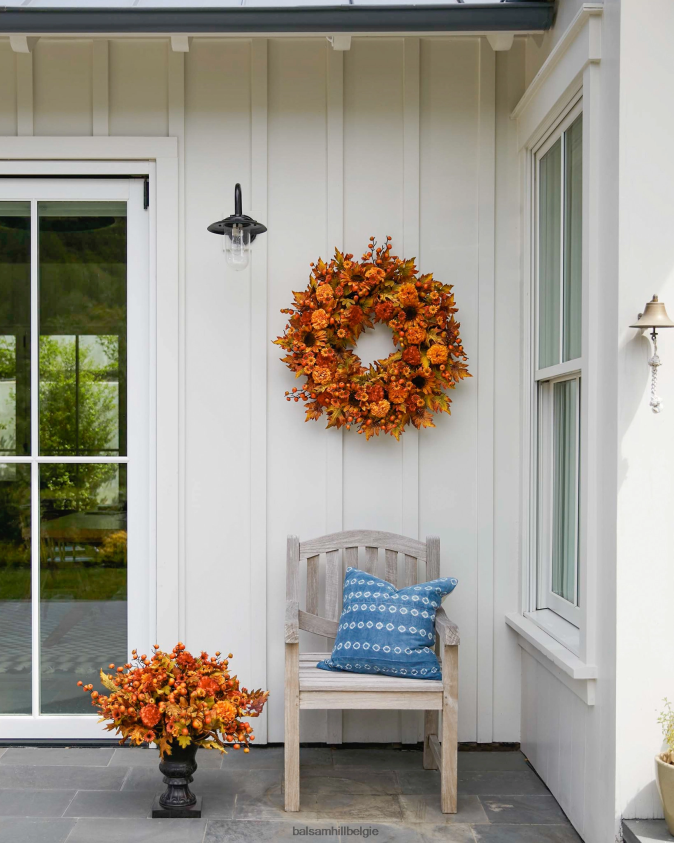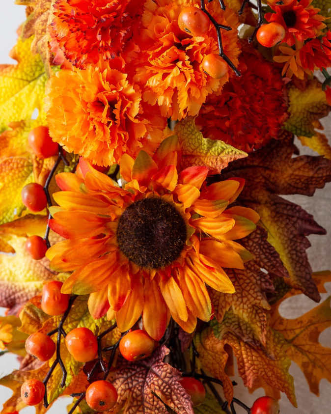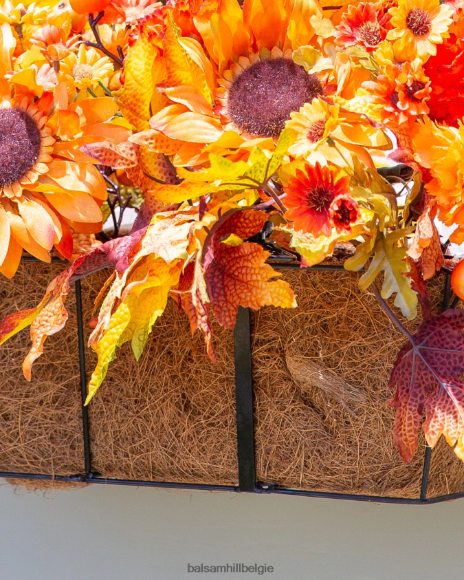Verlevendig herfstdecoraties met een kleurrijke mix van zonnebloemen, herfstbladeren en moeders. deze buitencollectie is uv-beschermd om zijn schoonheid en schittering te behouden, en zorgt voor een prachtig geheel als je hem samen op de veranda of op het terras plaatst.