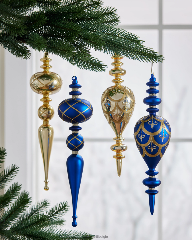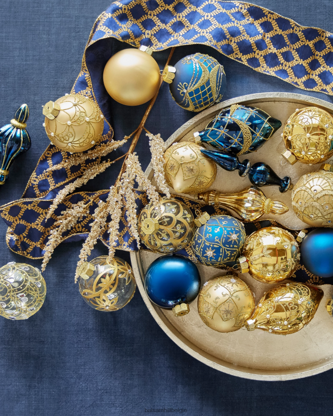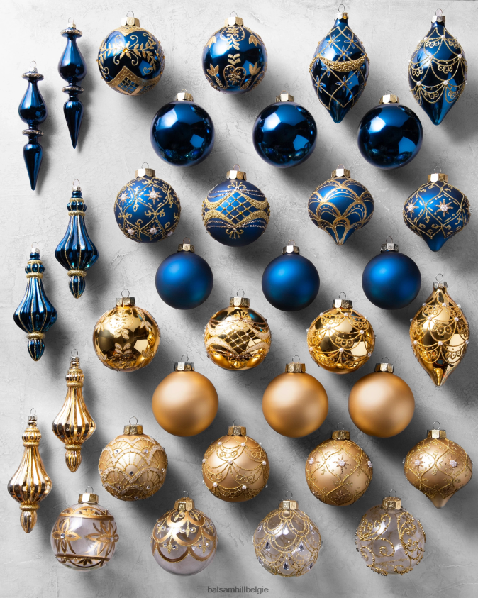 - bevat diverse ballen, eindstukken, uien en druppelornamenten in saffier- en goudtinten
