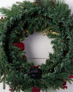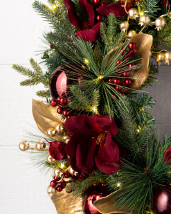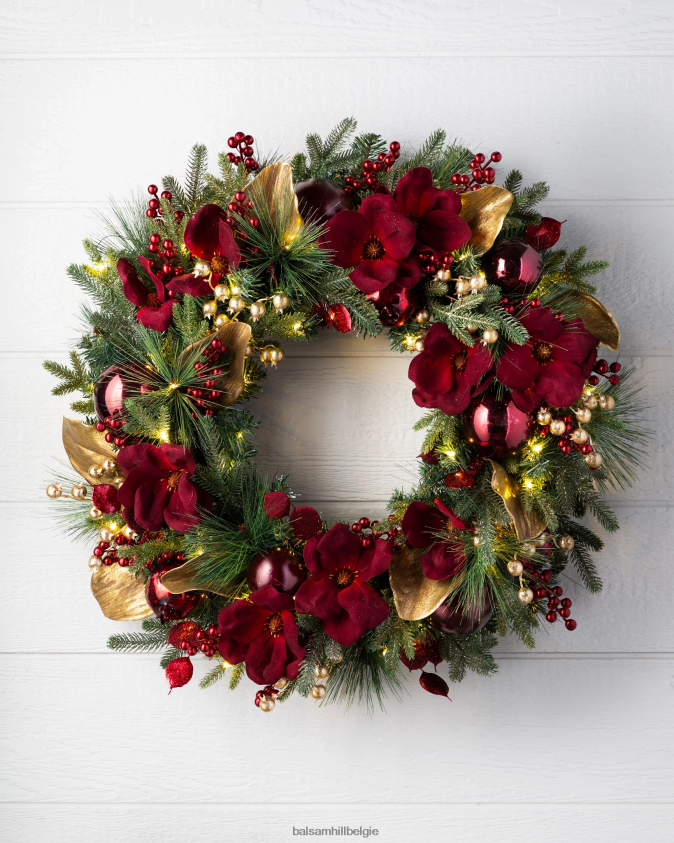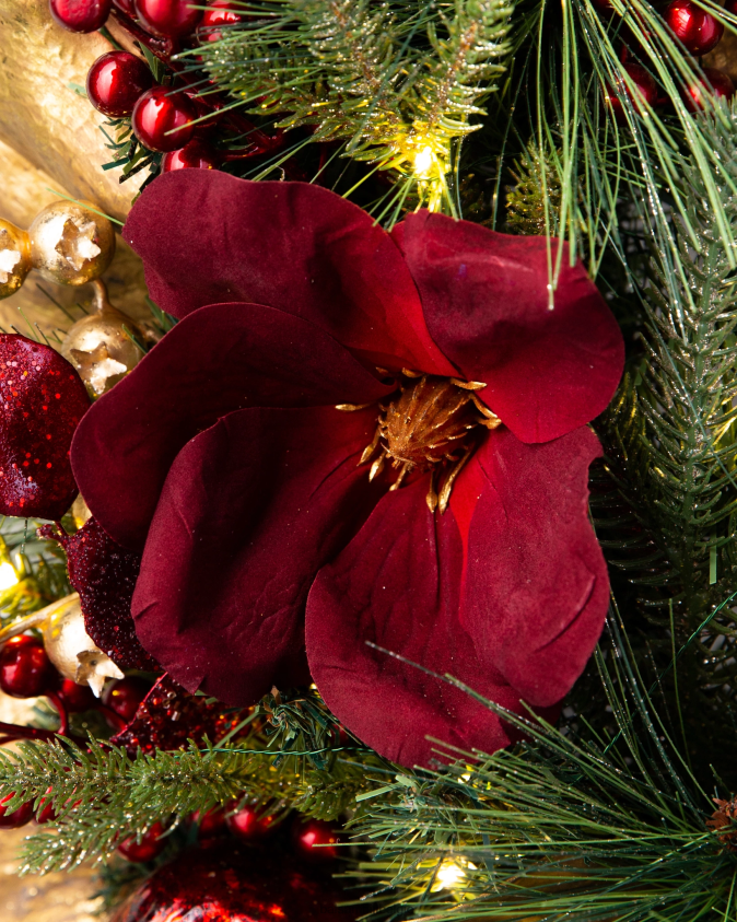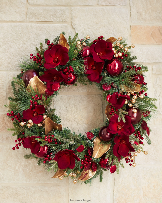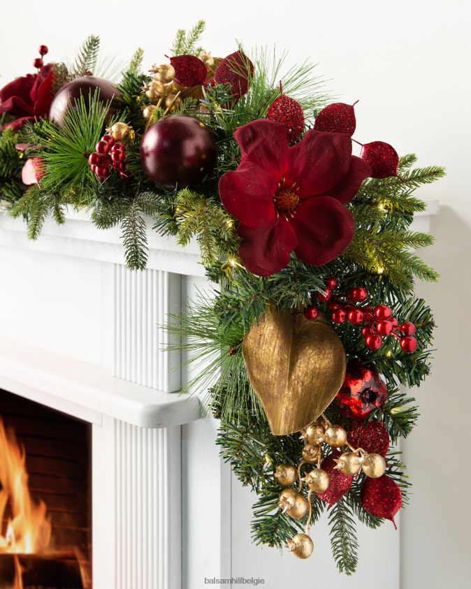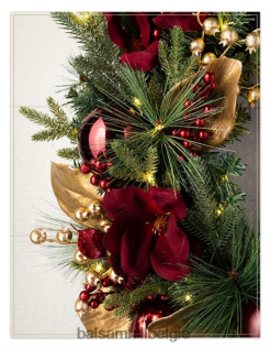 - Alle producten in deze collectie zijn voorzien van glinsterend dennenhout, geaccentueerd met fluweelrood magnolia’s, gouden magnoliabladeren, rode en gouden bessen, granaatappels en rode, onbreekbare ornamenten